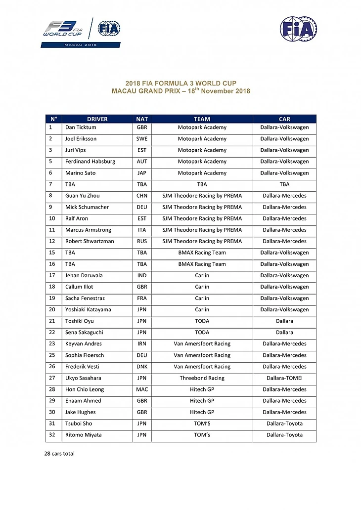 Пока подтверждены 28 из 32 участников, и в их число вошли самые успешные и известные молодые пилоты: победитель нынешнего сезона в европейской «Формуле-3» Мик Шумахер, лучший новичок «Ф-3» Роберт Шварцман, прошлогодний победитель Гран-при Макао Дэн Тиктум, а также вице-чемпион «Ф-3» прошлого года Йоэль Эрикссон, который 2018 год провел в ДТМ.