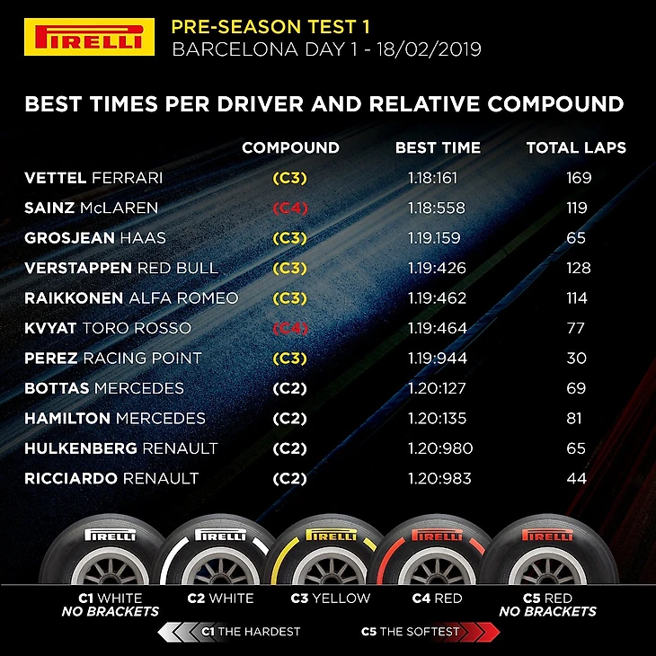 Тесты. Барселона. 1-й день. Феттель показал лучшее время, Сайнс – второй, Грожан – третий, Квят – 6-й
