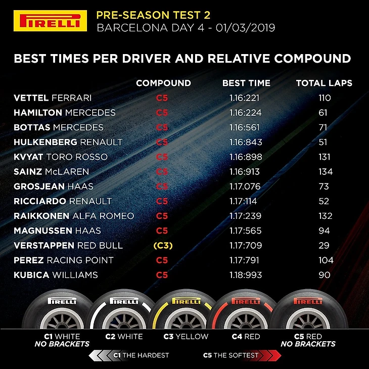 Тесты. Барселона. 4-й день. Феттель показал лучшее время дня, Хэмилтон – второй, Квят – пятый