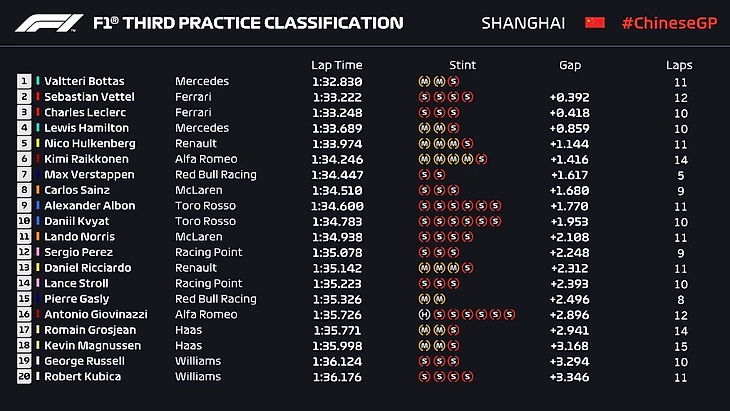 1. Валттери Боттас («Мерседес») – 1.32,830 (11 кругов)2. Себастьян Феттель («Феррари») +0,392 (12)3. Шарль Леклер («Феррари») +0,418 (10)4. Льюис Хэмилтон («Мерседес») +0,859 (10)5. Нико Хюлькенберг («Рено») +1,144 (11)6. Кими Райкконен («Альфа Ромео») +1,416 (14)7. Макс Ферстаппен («Ред Булл») +1,617 (5)8. Карлос Сайнс-младший («Макларен») +1,680 (9)9. Александр Албон («Торо Россо») +1,770 (11)10. Даниил Квят («Торо Россо») +1,953 (10)11. Ландо Норрис («Макларен») +2,108 (11)12. Серхио Перес («Рейсинг Пойнт») +2,248 (9)13. Даниэль Риккардо («Рено») +2,312 (11)14. Ланс Стролл («Рейсинг Пойнт») +2,393 (10)15. Пьер Гасли («Ред Булл») +2,496 (8)16. Антонио Джовинацци («Альфа Ромео») +2,896 (12)17. Ромен Грожан («Хаас») +2,941 (14)18. Кевин Магнуссен («Хаас») +3,168 (15)19. Джордж Расселл («Уильямс») +3,294 (10)20. Роберт Кубица («Уильямс») +3,346 (11)