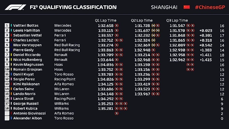 Гран-при КитаяШанхай Интернэшнл, Шанхай13 апреля 2019 годаКвалификация