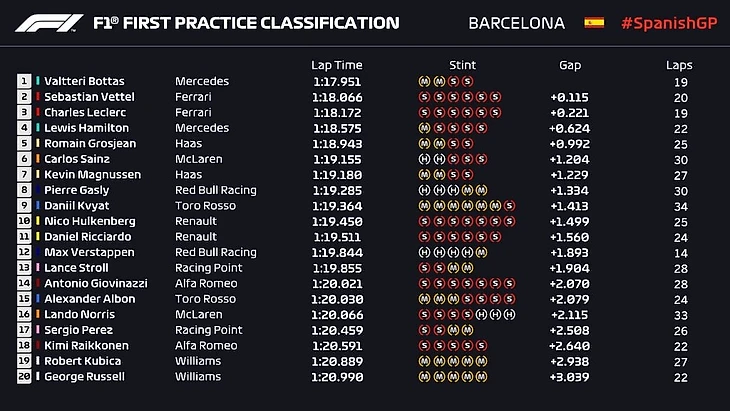Гран-при Испании. 1-я практика. Боттас – первый, Феттель – второй, Леклер – третий, Квят – 9-й