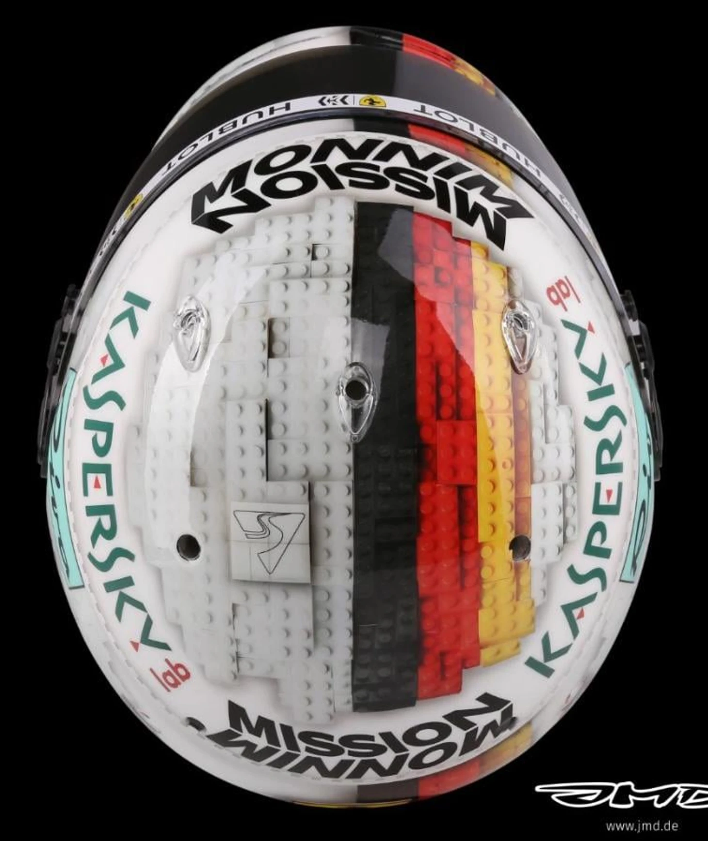 Датская компания не спонсирует замену шлема – дизайн отсылает к детству гонщика. Кроме немецкого флага, на шлеме можно заметить игрушечную фигурку мини-Феттеля.