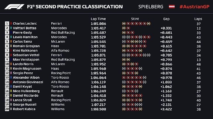 Гран-при Австрии. 2-я практика. Леклер – первый, Боттас – второй, Гасли – третий, Квят – 15-й