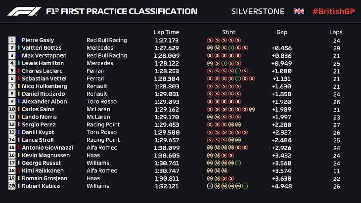 Гран-при Великобритании. 1-я практика. Гасли – первый, Боттас – второй, Ферстаппен – третий, Квят – 13-й