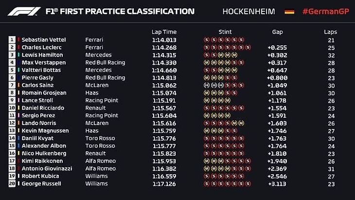 Гран-при Германии-2019. 1-я практика. Феттель – первый, Леклер – второй, Хэмилтон – третий, Квят – 14-й