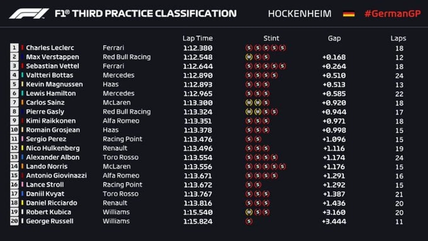 Гран-при Германии-2019. 3-я практика. Леклер – первый, Ферстаппен – второй, Феттель – третий, Квят – 17-й