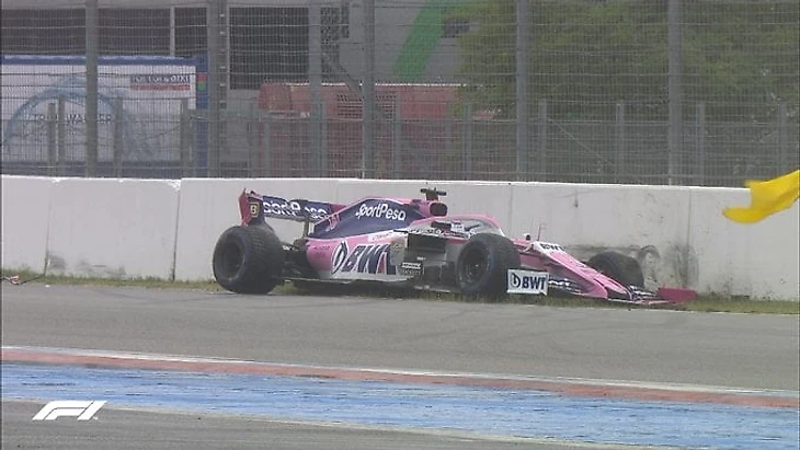Пилот «Рейсинг Пойнт» Серхио Перес попал в аварию на третьем круге Гран-при Германии в дождевых условиях. Машину мексиканца развернуло, Перес потерял контроль и врезался в барьеры.