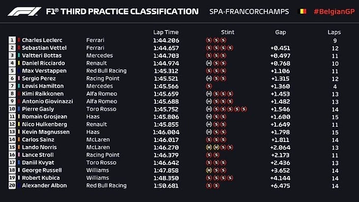 Гран-при Бельгии-2019. 3-я практика. Леклер – первый, Феттель – второй, Боттас – третий, Хэмилтон разбил болид, Квят – 17-й