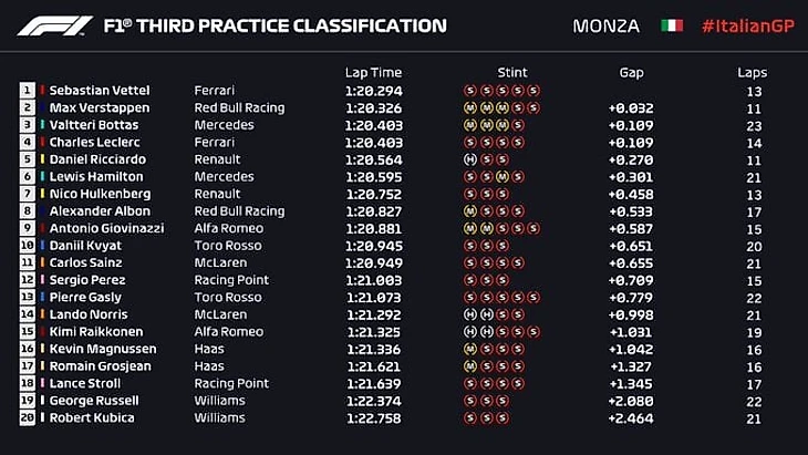 Гран-при Италии-2019. 3-я практика. Феттель – первый, Ферстаппен – второй, Боттас – третий, Квят – десятый