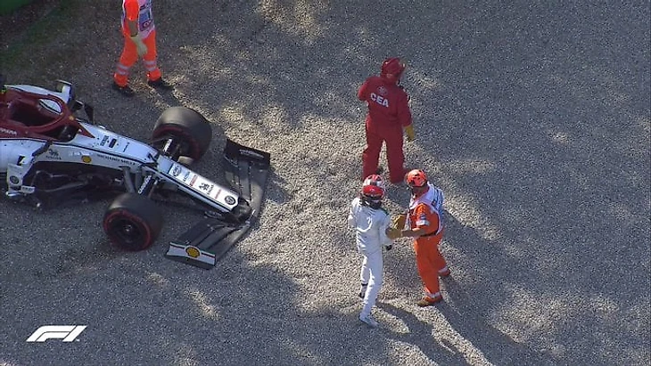 Финский гонщик не справился с управлением в повороте «Параболика» и врезался в барьеры задней частью болида.