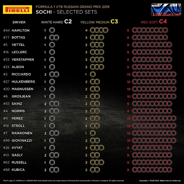 Выбор шин на Гран-при России (в таблице указано количество комплектов на гонщика)