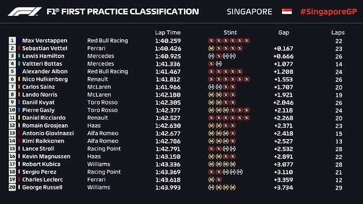 Гран-при Сингапура-2019. 1-я практика. Ферстаппен – первый, Феттель – второй, Хэмилтон – третий, Квят – девятый