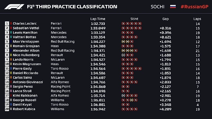 Гран-при России-2019. 3-я практика. Леклер – первый, Феттель – второй, Хэмилтон – третий, у Квята опять проблемы с машиной