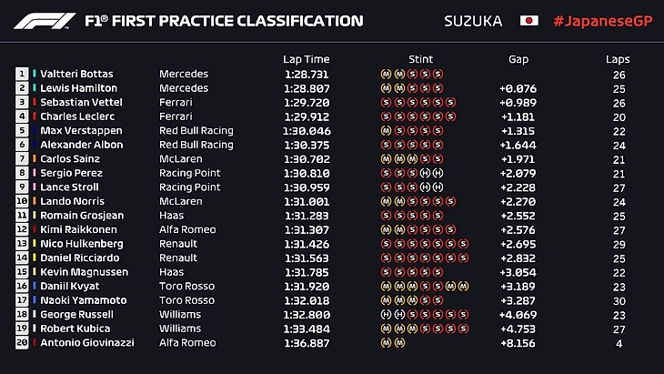 Гран-при Японии-2019. 1-я практика. Боттас – первый, Хэмилтон – второй, Феттель – третий, Квят – 16-й
