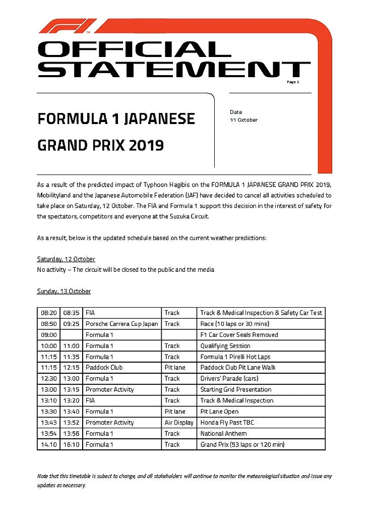 ФИА и организаторы Гран-при Японии объявили об отмене всех субботних заездов на трассе «Сузука» в связи приходом тайфуна «Хагибис».