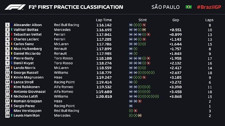Гран-при Бразилии-2019. 1-я практика. Албон показал лучшее время и разбил болид, Боттас – второй, Феттель – третий, Квят – девятый