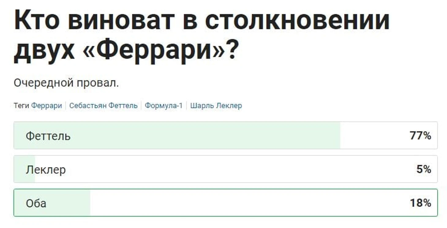 77 процентов пользователей Sports.ru считают Феттеля ответственным за столкновение с Леклером в Бразилии