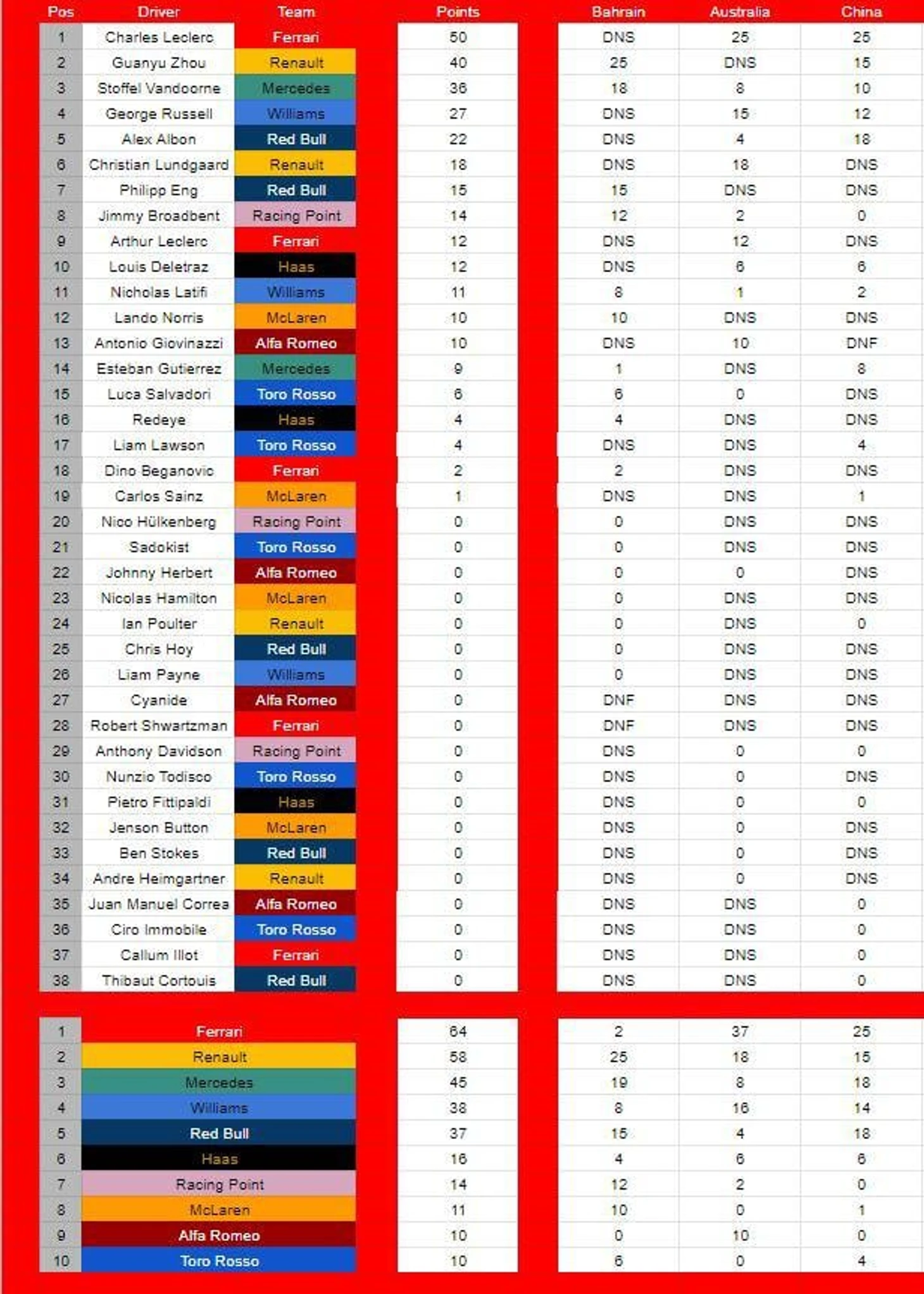 Как и в прошлый раз, Таблицу серии собрал пользователь Reddit с ником MrCarMemeBoy, который присвоил пилотам и командам очки в соответствии с текущей системой баллов в «Формуле-1». Отметим, что «Ф-1» не ведет официальную таблицу чемпионата.