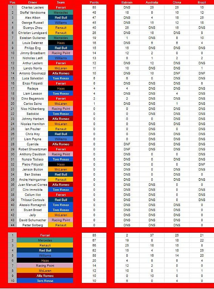 Пилот «Феррари» Шарль Леклер возглавляет неофициальный зачет виртуального чемпионата по итогам четырех Гран-при. Последний этап виртуальной серии состоялся на трассе «Интерлагос», где Леклер занял третье место. В общем зачете на счету Леклера 65 очков – монегаск выиграл две гонки, а в еще одной занял третье место. В виртуальном Гран-при Бахрейна Леклер участия не принимал.