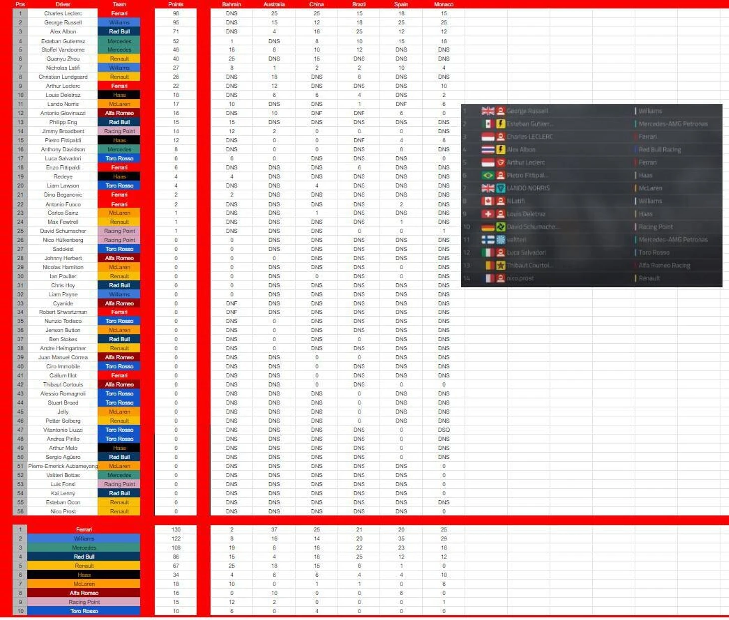 В виртуальном Кубке конструкторов первую позицию продолжает удерживать «Феррари». На втором месте находится «Уильямс», а далее расположились «Мерседес», «Ред Булл» и «Рено».