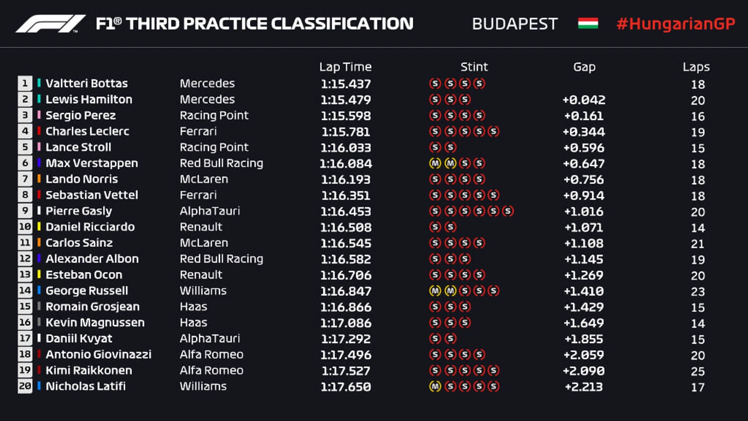 Гран-при Венгрии-2020. 3-я практика. Боттас – первый, Хэмилтон – второй, Перес – третий, Квят – 17-й