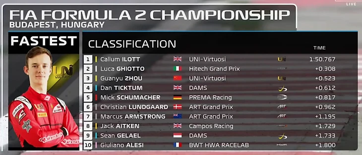 Лука Гьотто из «Хайтека» показал второе время с отставанием в 0,308 секунды, напарник Айлотта Чжоу Гуаньюй замкнул топ-3 (+0,523).