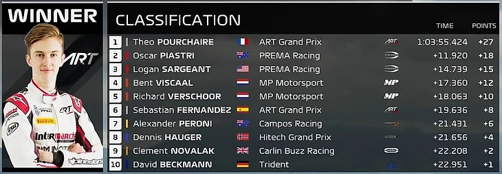Пуршер оторвался от конкурентов почти на 12 секунд и вышел на третье место в личном зачете. Вторую позицию завоевал гонщик «Према» Оскар Пиастри, третью – его напарник Логан Сэрджант.