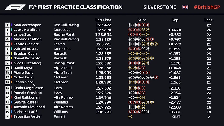 Гран-при Великобритании-2020. 1-я практика. Ферстаппен – первый, Хэмилтон – второй, Стролл – третий, Квят – десятый