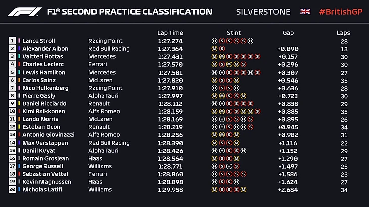 Гран-при Великобритании-2020. 2-я практика. Стролл – первый, Албон стал вторым и разбил болид, Боттас – третий, Квят – 15-й