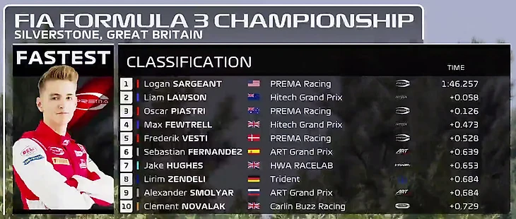 Гонщик «Према» Логан Сэрджант показал лучшее время в квалификации к гонке «Формулы-3» в Сильверстоуне.