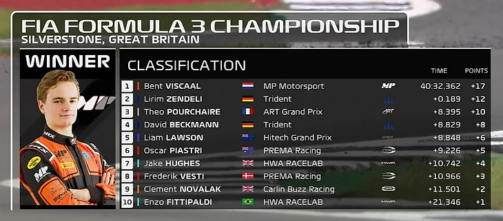 Борьба за подиум развернулась между Лиамом Лоусоном, Давидом Бекманом и Тео Пуршером – юниор «Ред Булл» упустил подиум на последних метрах: третьим стал Пуршер, вслед за которым с разницей в 0,02 секунды финишировали Бекман и Лоусон.