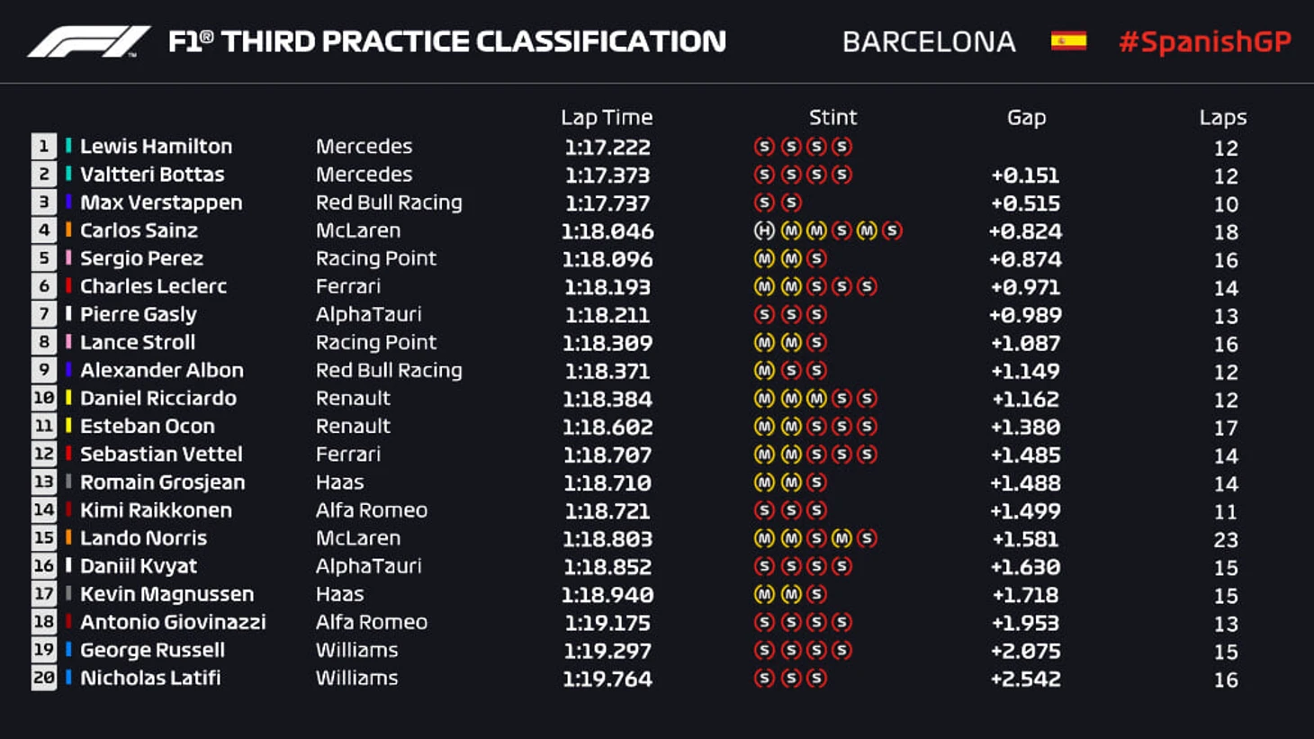 Гран-при Испании-2020. 3-я практика. Хэмилтон – первый, Боттас – второй, Ферстаппен – третий, Квят – 16-й