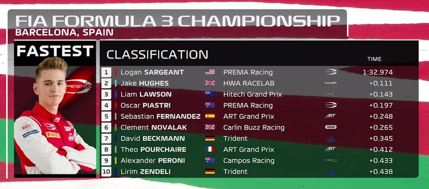 Формула-3. Испания. Сэрджант выиграл третий поул подряд, Смоляр – 14-й