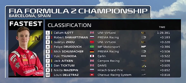 Формула-2. Испания. Айлотт выиграл поул, Шварцман – второй, Чжоу – третий, Мазепин – 9-й, Маркелов – 11-й