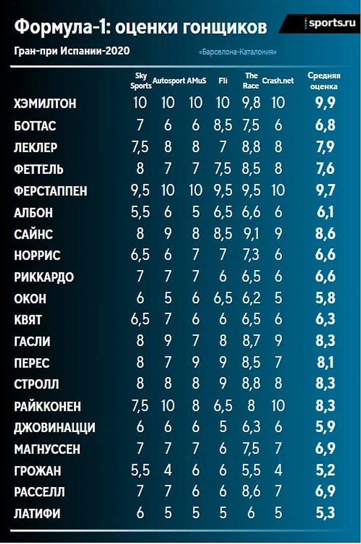 Европейские спортивные издания выставили оценки (по 10-балльной шкале) гонщикам «Формулы-1» за Гран-при Испании.