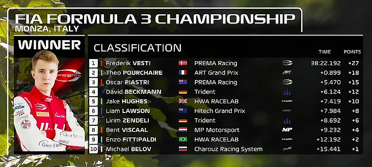 Формула-3. Вести выиграл первую гонку в Монце, Белов – десятый, Смоляр – 20-й, Пиастри вернул лидерство в чемпионате