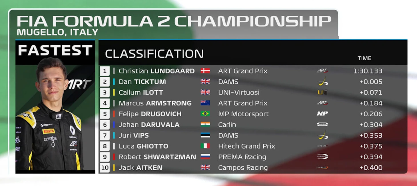 Второе время дня показал гонщик «ДАМС» Дэн Тиктум, третье – лидер чемпионата Каллум Айлотт. Российский пилот Роберт Шварцман стал девятым, его напарник по «Према» Мик Шумахер – 15-м, Юки Цунода из «Карлина» – 11-м, гонщик «Хайтека» Никита Мазепин – 14-м, представитель «ХВА» Артем Маркелов – 19-м.