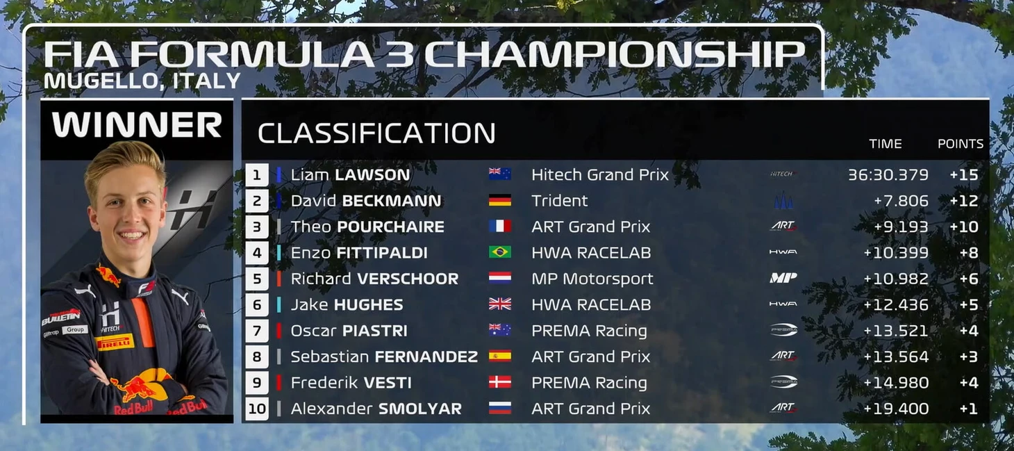 Воскресный заезд в Тоскане выиграл гонщик «Хайтека» Лиам Лоусон, вторым стал представитель «Трайдента» Давид Бекман, третьим – Тео Пуршер из «АРТ».