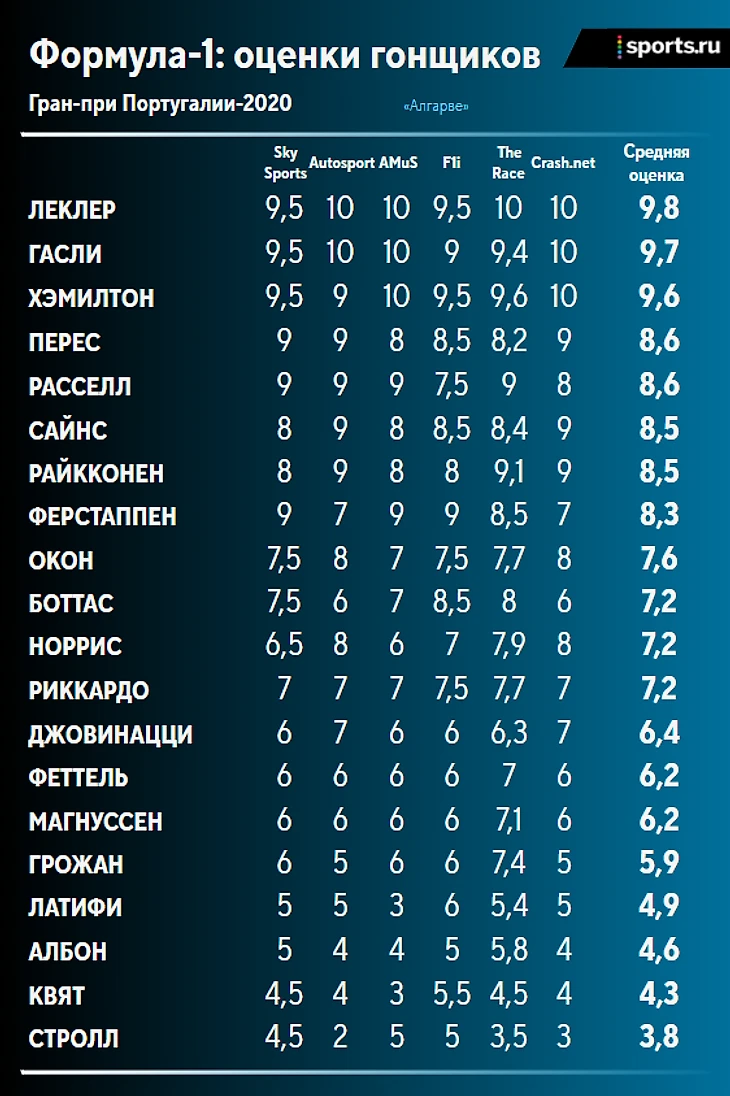 Европейские спортивные издания выставили оценки (по 10-балльной шкале) гонщикам «Формулы-1» за Гран-при Португалии.
