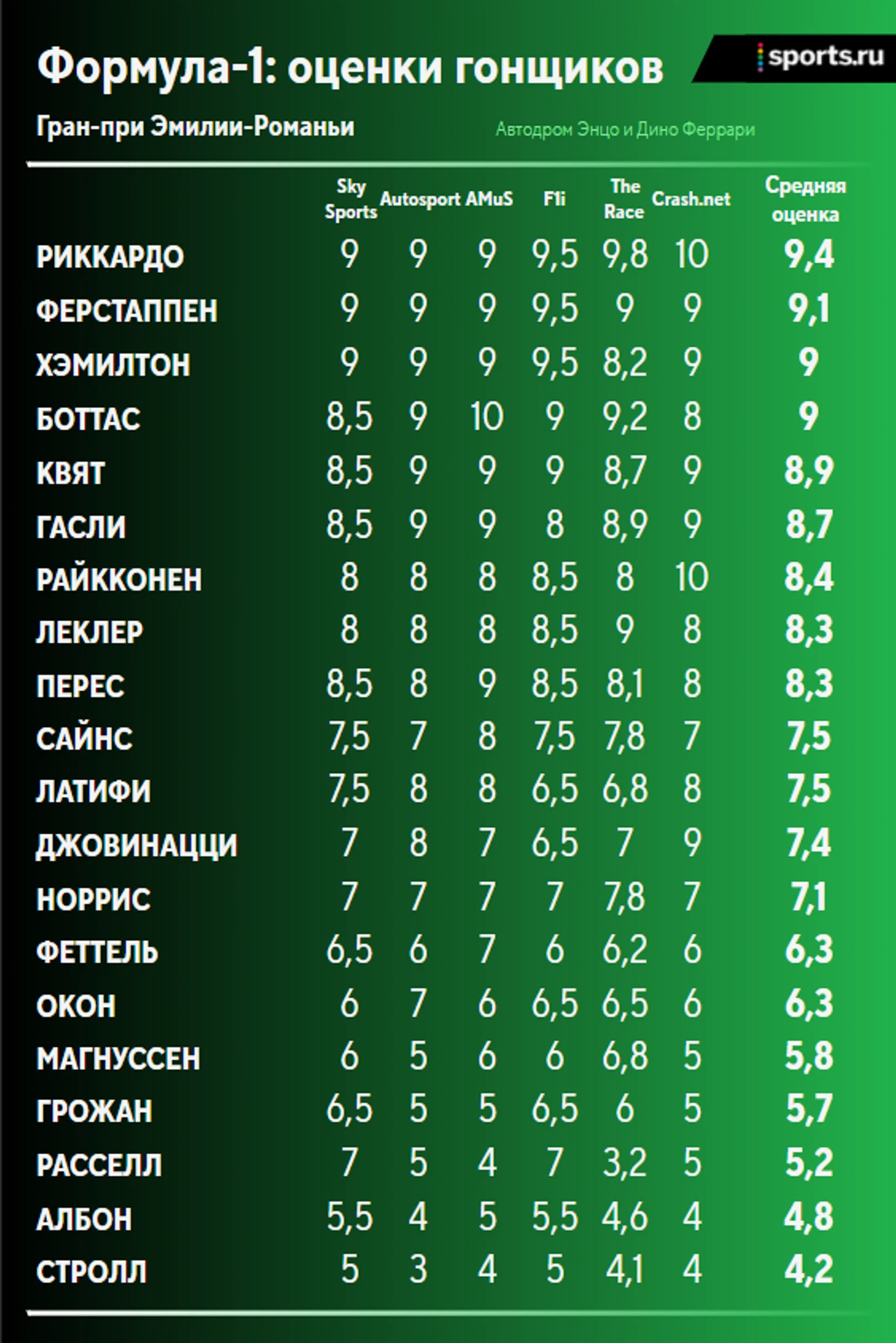 По мнению экспертов, в Имоле лучше других проявил себя пилот «Рено» Даниэль Риккардо, во второй раз за три гонки поднявшийся на подиум. В топ-5 также попали Макс Ферстаппен из «Ред Булл», сошедший из-за взрыва покрышки, напарники по «Мерседесу» Льюис Хэмилтон и Валттери Боттас, а также гонщик «Альфа Таури» Даниил Квят, финишировавший четвертым.