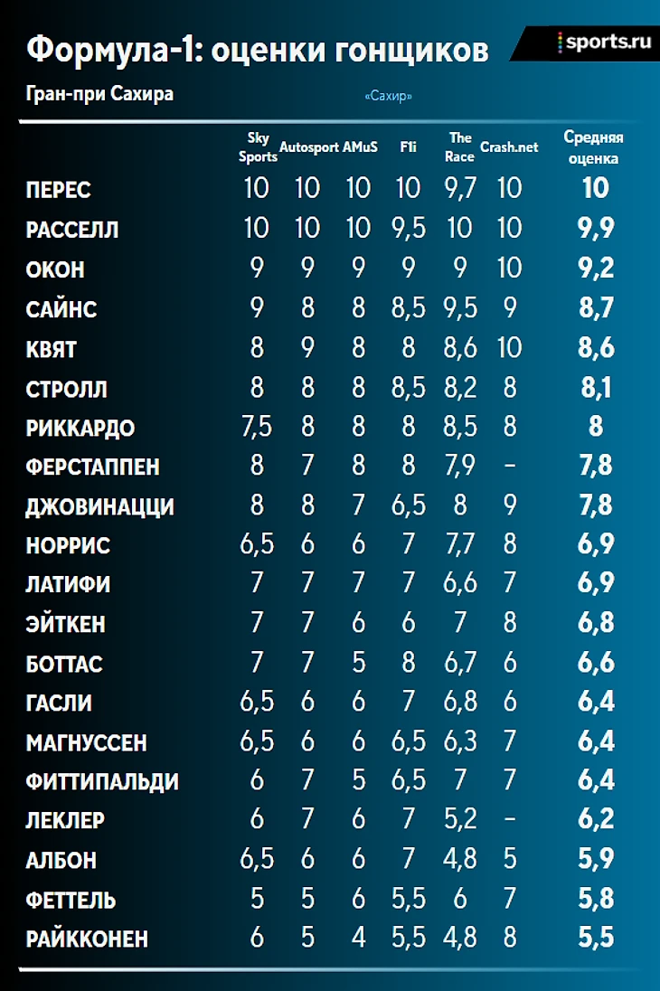 Европейские спортивные издания выставили оценки (по 10-балльной шкале) гонщикам «Формулы-1» за Гран-при Сахира.