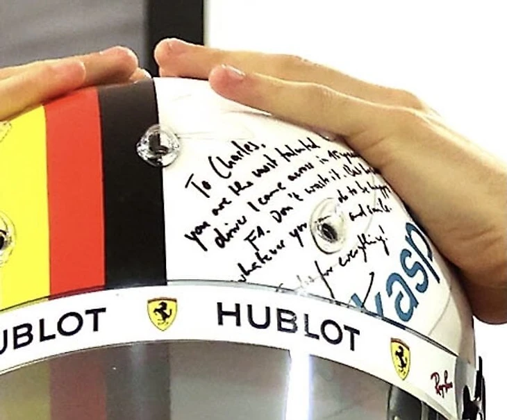 Пилот «Феррари» Себастьян Феттель попрощался с Шарлем Леклером особым посланием, которое было написано на шлеме, подаренным немцем своему теперь уже бывшему напарнику.