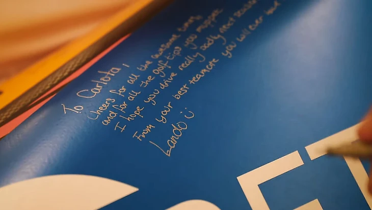 «Макларен» преподнес Карлосу Сайнсу прощальный подарок – кусок обшивки болида, на котором сотрудники команды оставили свои пожелания.