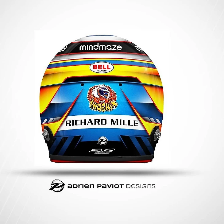 На задней части шлема Грожан расположил изображение гонщика в пламени с надписью «феникс» – так Ромен назвал себя после того, как выжил в аварии на Гран-при Бахрейна «Формулы-1».