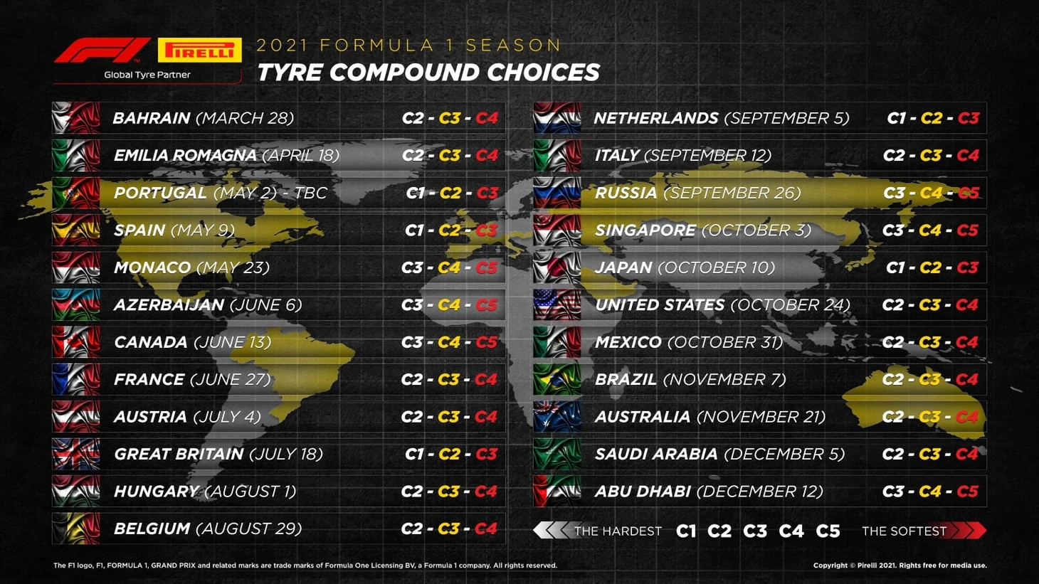 Наиболее жесткий по составу набор шин команды получат на этапах в Португалии, Испании, Великобритании, Нидерландах и Японии.