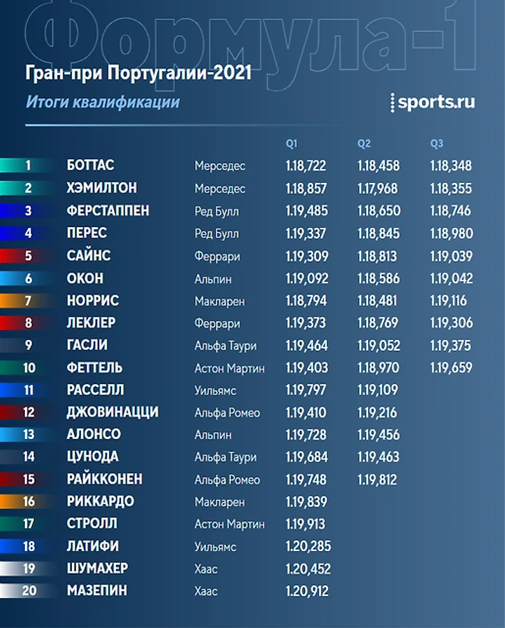 Гран-при Португалии-2021. Квалификация. Боттас выиграл поул, Хэмилтон – 2-й, Ферстаппен – 3-й, Мазепин – 20-й