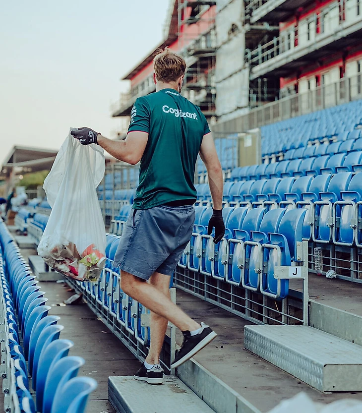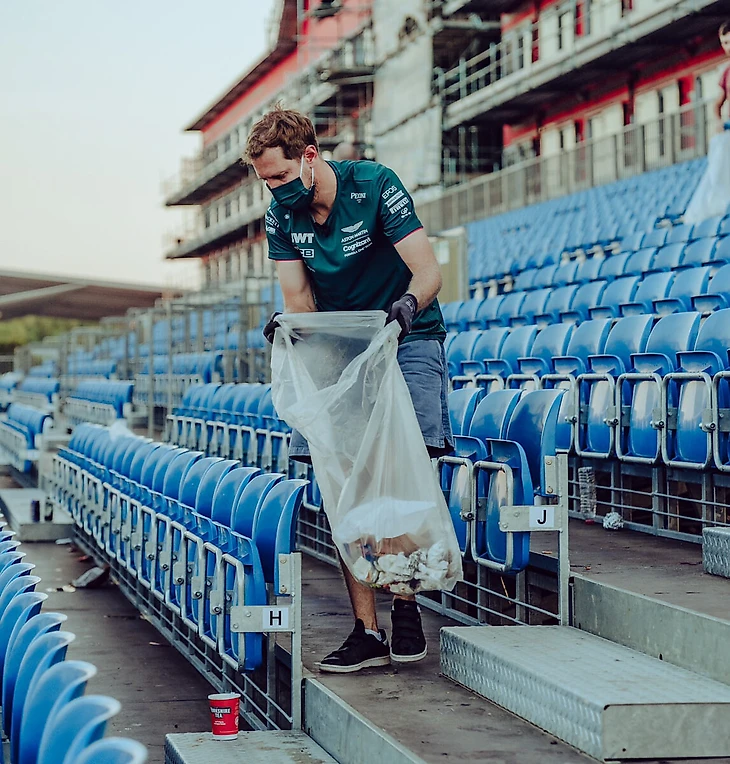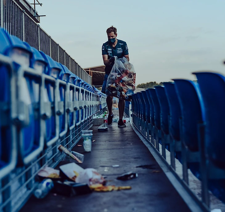 Гонщик «Астон Мартин» Себастьян Феттель вместе с группой болельщиков остался на автодроме «Сильверстоун» после финиша Гран-при Великобритании и помог убрать мусор.