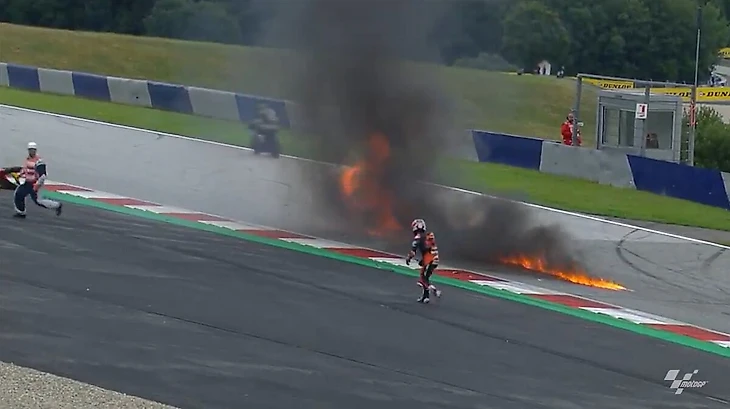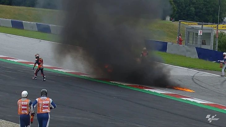 Дани Педроса, выступающий на Гран-при Штирии по уайлд-кард за «КТМ», упал в третьем повороте, и в его байк врезался гонщик «Априлии» Лоренцо Савадори. В результате инцидента на асфальт пролилось топливо, и участок трассы оказался в огне.