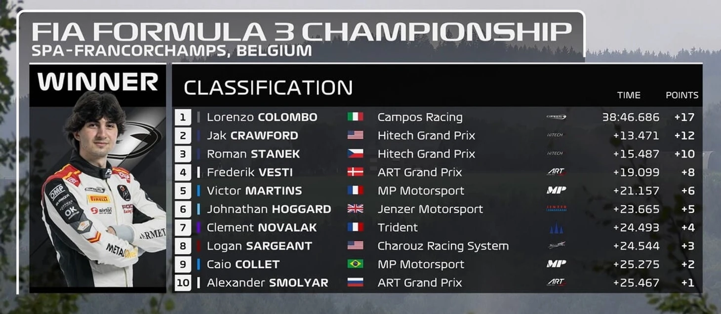 Формула-3. Бельгия. Коломбо выиграл 1-ю гонку под дождем, Смоляр – 10-й